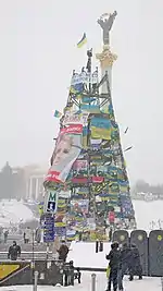 During the Euromaidan Protests in 2013–2014, the protesters prevented the Christmas tree from being completed in the Independence Square in Kyiv, and has since been satired as being the "Yolka". This tree has also been a symbol of the Revolution of Dignity[4], and was not taken down until August 2014[5].