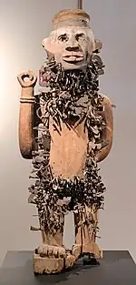 The artistry of Yombe figurines and statues is well known, usually objects of prestige, kings seated on the throne, or female phemba (maternity) statues.[4] Nkisi nkonde figurines, masks and drums are also made for ceremonies.[5] Their funerary figures are renowned for their realistic depictions.[6]