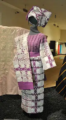 - Aso-oke: a hand-woven cloth of the Yoruba People. It is considered the most prestigious of traditional fabrics in Nigeria and is worn to special occasions such as weddings, festivals, and coronations. Aso-oke comes in three main types based on their colors: etu (deep blue with thin light blue stripes), sanyan (beige silk from the cocoons of the Anaphe moth), and alaari (magenta waste silk). Aso-oke can also have various colour patterns, designs and motifs woven into it, such as stripes, checks, flowers, animals, or geometric shapes.[10]