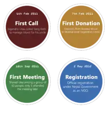 Youth For Blood (YFB) is a youth-led, non-profit, and service motivated circle of youths devoted to the welfare of blood donors and seekers in Nepal. Established in 2011 in Biratnagar, it has extended its network to 13 different cities and is still growing. One of the main objective of the organization is to manage fresh blood for people in need for free: YFB has saved over 4500 lives by managing over 6000 pints of blood and 3000 standby donors. Currently, YFB has a network of more than 50,000 blood donors throughout Nepal, 15,000 of which are registered blood donors while the remaining are people who can be reached through social networks.[2]