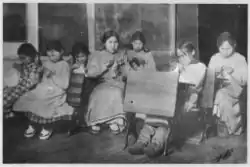 Yup'ik women roles included child rearing, food preparation and sewing. Skin sewing is artistic arena in which Yup'ik women and a few younger men excel. Everyday functional items like skin mittens, mukluks, and jackets are commonly made today, but the elegant fancy parkas of traditional times are now rare.[5] The proper sewing of skins requires considerable and varied traditional knowledge and an intact extended family whose members help in hunting gathering, and processing the various components in addition to sewing.[5] Women's tools include ulu, scraper, scraping board, needle, needle case, thimble, and pattern. There are many regional differences in the design and function of these tools.[7]