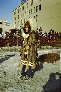 Fancy parka (atkupiaq sg atkupiak dual atkupiat pl, literally "real parka, genuine parka") is a fur parka made of ground squirrel, muskrat or mink pelts with traditional fancy decorations (such as one style that has a band across the chest area and eight tassels hanging front and back). The tassels, it is said, represent fingers. Among the Yup'ik, traditional style women's parkas are still made and worn on festive occasions. Men's fancy parkas are no longer made, although a few elders still recall their forms and decoration.[5] The atkupiaq is the most popular type of woman's parka among the Yup'ik living along the Kuskokwim River and in the Kuskokwim Bay area. This parka is very long by comparison with Canadian Inuit parkas, with an even lower edge. The border is decorated with a geometric design of black and white pieces of calfskin. On older parkas, the border was lined with a band of calfskin with fine decorative stitching, symbolizing footprints on snow. The hood with its beautiful ruff is much smaller than on a Canadian Inuit woman's amauti, and there is no pouch for carrying a baby.[10] Some elements (certain stitches, tassels, specific strips of fur, beads and shapes of hide) on a parka represent specific parts of an historic story.[11] Fancy parka a very important component of Yup'ik culture. An atkupiaq is a signifier that tells a story to Yup'ik wievers, much like the robes worn by Alaska Natives of the Northwest Coast (as Eyak, Tlingit, Haida, Tsimshian).[5] Traditional Yup'ik oral stories (qulirat and qanemcit) were embedded in many social functions of the society. Storyknifing (yaaruilta literally "let's go story knife!") stories a traditional and still common activity of young girls and are told by children of all ages in Yup’ik-speaking Eskimo villages in Alaska. These stories are illustrated by figures sketched on mud or snow with a ceremonial knife, known as story knife or story telling knife (yaaruin sg yaaruitek dual yaaruitet pl in Yup'ik, saaruin in Yukon dialect).[3] Stories were told through the use of the yaaruin, the story knife by the women and young girls and most importantly stories were found within the traditionally Yup’ik clothing. The women had to pass this knowledge on to their daughters so that the clothes would reveal the correct story of the family and the men had to recognize these stories on the clothing.[12] In the past, dressing in fine fancy clothing was reserved for ceremonial events like festivals in the qasgiq, when animals and spirits (yua) were honored.[5] The tradition of the fancy parka continues there today.[8]