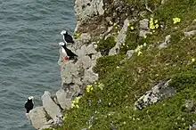 Nunivaarmiut Cup'ig bird skin and feather parkas are alpacurrlugar (murre skin and feather parka) made from Uria aalge skin with feathers, cigurat atkut (guillemot skin and feather parka) made from Cepphus columba skin with feathers, alpacurrlugar (auklet skin and feather parka) made from the white part of the Aethia cristatella skin with feathers, qilangar (puffin skin and feather parka) made from Fratercula corniculata skin with feathers, aarraangiarat (oldsquaw skin and feather parka) made from Clangula hyemalis skin with feathers, metrar (eider skin and feather parka) made from Somateria mollissima skin with feathers, tengaurtet (kittiwake skin and feather parka) made from Rissa tridactyla skin with feathers (used as camouflage for sliding over the ice to sneak up on game).[16] In the Nunivak, seabirds, particularly murres, nest in numbers, the natives paying annual visits to the nesting grounds to secure skins of puffins, murres and others for clothing.[28] The bird skins most commonly used for clothing were those of the cormorant (Phalacrocorax pelagicus), common or Pacific eider (Somateria mollissima), king eider (Somateria mollissima), Steller's eider (Polysticta stelleri), common murre (Uria aalge), horned puffin (Fratercula corniculata). Cormorant and eider were considered more valuable and gave more prestige to the owner. Bird skin parkas are light and comfortable to wear but tear easily. Such parkas were usually reversible, worn with the feathers next to the body in winter with a cloth garment over the parka to cover the rough, yet fragile, skin side. At night the parka was turned and slept in or used as a blanket with the feathers on the outside.[9] Bird skin parkas were shaped like those made of animal skin, but because of the great thickness of the feathers and the general bulk, they did not have fur strips, beading, and other decoration. Cuffs and bottom borders tended to be plain except on murre parkas.[9] Tufted puffin skins were counted and sold in "knots" or bundles of six. Thirty-four skins were necessary for a man's parka and 28 for a woman's.[9] The common puffin is smaller, so six knots and four extra skins were required for a man's parka, five knots and four extra for a woman's.[9] Puffins are found only along the cliffs near Nash Harbor, and residents of Mekoryuk had to trade for them with those living in the settlement there. Sufficient puffins for a parka could be obtained in exchange for one bearded seal skin.[9] Parkas made of cormorant skins were worn only by women. The skins of these birds are larger than those of murres and puffins.[9] When murre skins were prepared for parka use, they were roughly square in shape and included the breast and the sides. Two narrow black backs were sewn together to form the crown of the hood.[9]