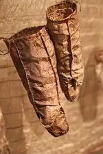 Calf-high mukluk (piluguq sg piluguuk dual piluguut pl in Yup'ik; often used in the dual)) is winter calf-high skin boot. It is worn by both men and women, but men's boots are larger than women's. The men's boots don't really have decorations. They only put decorations on women's boots.[50] This boots made of caribou leg skins were sewn using the front of the caribou's back leg on the boot's front and the back of its front leg on the boot's back; this avoided the skin that was worn thin by the animal's habit of kneeling to forage.[13][19]
