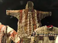 Fish skin parka (qasperrluk in Yup'ik; derived from qaspeq "parka cover kuspuk" and the postbase -rrluk "N that has departed from its natural state (often, though not always, with an undesirable connotation)", amirag in Cup'ig) is a kind of fish-skin clothing (amiragglugaq) also that could serve as a tent.[3][21] Fish skin parkas in the past were worn by both men and women when hunting and traveling. In winter they were worn over a fur parka just as cloth covers have been in more recent times.[9] A Yukon fish skin parka made of dog salmon (Oncorhynchus keta) skin.[22] Nunivaarmiut men wore parkas made of silver salmon (Oncorhynchus kisutch) skin, while those of women were made of salmon trout (charr) (Salvelinus malma) skin and often had a white fox ruff on the hood.[9] The Nunivaarmiut Cup'ig did not prepare their own fish skins for parkas, but bought them, already prepared, from Yup'ik people on the Yukon and Kuskokwim rivers. These imported skins had been stretched, smoke-dried, and scaled.[9]