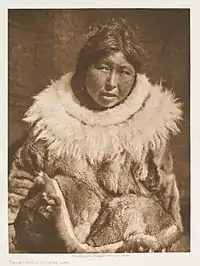 Children's clothing (mikelnguut aturait) was made of soft skin of younger animals. Reindeer fawn and dog puppy skin parkas, with the fur inside, were made for babies (irniaq) and small children (mikelnguq). Puppies one and two months old were killed for the purpose. Fawn and puppy skins were turned inside out, scraped, hung out to dry, and then put away. When needed the skins were taken from storage, rubbed between the hands with a rotary motion, and chewed as necessary to soften and loosen tissue that had not previously been removed.[9] For a sealskin parka, one skin was required for a three-year-old, two for a five- or six-year-old, and three for a child of 10 or 12 years. A small child's sealskin parka was often decorated with tassels of the same material stitched to the upper center of the back. A baby's boots were always made with the fur inside but otherwise were similar in construction to adult boots. In former times, babies wore long boots and no pants. When a child was toilet trained, pants separate from boots were put on a boy, while girls were given trouser-boots like those worn by women.[9]