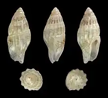 (Original description) The very minute shell is obesely fusiform and moderately solid. It is yellowish marked with some faint angular brown lines or with white belts at the suture, periphery and base, and marked with angular brown lines, and a row of oblong spots above the middle.