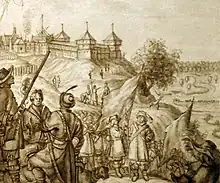 Zamkova Hora hill (Ukrainian: Замкова Гора, literally Castle Hill) in Kyiv, Ukraine is a historical landmark in the center of the city.[1] It is part of the city's geographic relief complex known as Kyiv Mountains (or Kyiv Hills). The place is called "Zamkova" because Vytautas the Great had his castle here. The Lithuanian castle had 18 towers.[2] Other names: Khorevytsya, Kyselivka, Frolovska, Lysa Hora. Some important events of Ukrainian history took place on the hill.