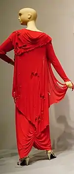Rhodes created handmade evening wear using her unique feminine textiles. Each garment created incorporates different types of feminine style into place. She made her biggest splash in 1977 with the establishment take on punk, which she called Conceptual Chic.[11][12] She created dresses with holes and beaded safety pins – 10 years before Versace – to form a sort of embroidery, mixed with loosely drawn figures screen-printed on silk jersey, or on the newly developed Ultra suede fabric.[8] When she creates her garments a lot of thought goes into the construction. Simplistic shapes help mould the foundation of Rhodes's garments. The foundation of the shapes, functions as an enhancer that maximizes the effects of her prints. She achieves this look by using techniques including layering, smocking, and shirring.[6] All of Zandra Rhodes's garments are constructed around the design of her distinct prints, despite being structured around the formation of the dress.[9]