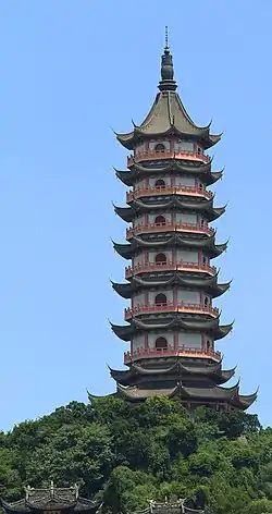 The Zhaobao Mount Scenic Area includes walking trails on and around the hill with numerous sites to explore during a visit. These include the 57.6-metre-tall (189 ft) seven-story Aozhu Pagoda, the 2,000-foot-long (610 m) 10-foot-thick (3.0 m) Weiyuan City Wall built during the Ming Dynasty, and the even older Zhenhai Seawall originally built in 897 CE during the Tang Dynasty. Sanskrit rock carvings, including a Buddhist prayer chant, are one of the oldest features of the hill. The Tianhou Temple is dedicated to the Heavenly Empress (see also Mazu) and the Guanyin Pavilion is dedicated to the Goddess of Mercy (see also Guan Yin). The mountain is named after the sea god Zhāobǎo Qīláng, a forerunner of the more recent sea deity Qianliyan, a subordinate of the goddess Mazu.