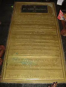 Ziegenbalg was troubled by ill health his entire life, a condition aggravated by his work in the mission field. He died on 23 February 1719, at the age of thirty-six, in Tranquebar. His last 13 years were spent laying the foundations for German scholarship in Tamil that continues to this day. Ziegenbalg is buried at the New Jerusalem Church, which he helped establish in 1718 at Tranquebar.[15][16]