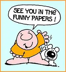 Ziggy, nameless at his conception, has been visible in some form or another since the mid-1960s. Greeting card writer Tom Wilson first drew a Ziggy-like character as an elevator operator offering political commentary in editorial cartoons, but no one would syndicate it. Ziggy eventually appeared in an American Greetings gift book, When You're Not Around (1968)[2] which caught the eye of Kathleen Andrews, a founder of the fledgling startup Universal Press Syndicate, which badly needed a popular comic to keep it afloat. A deal was struck, a name was given, and Ziggy was born.[3] The strip began in 15 newspapers in June 1971,[4] and that number eventually grew to over 600 publications. A Sunday strip premiered on April 1, 1973.[5]