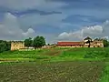 Złoty Potok (now Zolotyy Potik) Castle preserved well even though remained in desolation and partial ruination. This historic landmark positioned at the city's central headquarters nearby a rivulet falling into Złoty Potok pond. The villagers' residences located next to the stronghold bulwark. The castle has regular features and shaped in the form of rectangular. It was built out of local field stone of granite and auburn color. Bulwark thickness varied around 2 m (7 ft), and the corners of each wall has a tower with three levels of embrasures. The midsection of south north curtain wall contains a gate house being the style of Late Renaissance. Originally castle was of one story tall. The second story was added later. On the inside the gate ornamented with hereditary insignia of Potocki family, Piława.