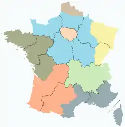 Eight ZEAT of metropolitan France, with each color denoting one ZEAT. Also visible are the borders (in black) of the 13 metropolitan regions