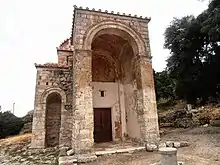The katholikon, whose foundations survive, was a cross-in-square domed church with three semicircular apses, and sported a floor decoration by inlaid marble in geometric patterns very similar to the nearby Church of Hosios Loukas.[1] The katholikon collapsed ca. 1890, and the narthex was transformed into the current church.[2] The narthex is roughly octagonal, with four crosswise central vaults and niches in the corners.[1][2] From the rest of the monastery, only portions of the surrounding walls and, to the north, the foundations of the monastery baths, datable to the 13th century, survive.[1]