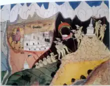 The Rajputs of Jammu and Himachal have traditionally excelled in mountain fighting; therefore Zorawar had no trouble in crossing the mountain ranges and entering Ladakh through the source of the Suru River where his 5000 men defeated an army of local Botis.[13] After moving to Kargil and subduing the landlords along the way Zorawar received the submission of the Ladakhis — however Tsepal Namgyal, the Gyalpo (ruler), sent his general Banko Kahlon by a roundabout route to cut off Zorawar's communications. The astute general doubled back to Kartse, where he sheltered his troops through the winter. In the spring of 1835 he defeated the large Ladakhi army of Banko Kahlon and marched his victorious troops towards Leh. The Gyalpo now agreed to pay 50,000 rupees as war-indemnity and 20,000 rupees as an annual tribute.[13]