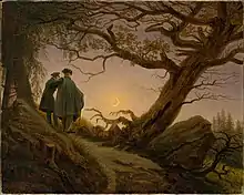 The painting in the Galerie Neue Meister in Dresden was included in 1830 in Johan Christian Dahl's collection under the title Mondscheinlandschaft. Zwei männliche Figuren betrachten den aufgehenden Halbmond (Moonlit Landscape: Two Male Figures Observing the Rising Half-Moon); he sold it to the Royal Art Gallery in Dresden in 1840 for 80 talers.[13] Dahl had obtained the painting from Friedrich in exchange for a work of his own. The painting in Berlin of a man and a woman was at the Salomon art dealership in Dresden in 1922. In 1932 it was shown at the Paul Cassirer gallery in Berlin on loan from the collection of Lulu Böhler in Lucerne, and it was bought that year by the Alte Nationalgalerie from the Fritz Nathan Gallery of Lucerne.[14]